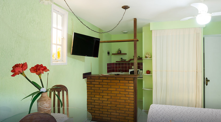 The Bougainville loft has capacity for three guests. It has LCD TV 32 "with cable TV, kitchen with microwave, fridge, air conditioning, closet and wi-fi.