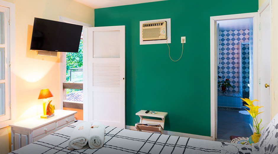 The Hortência Suite has capacity for two guests, with private balcony. It has 32" LCD TV with cable TV, minibar, air conditioning, cabinet and wi-fi.